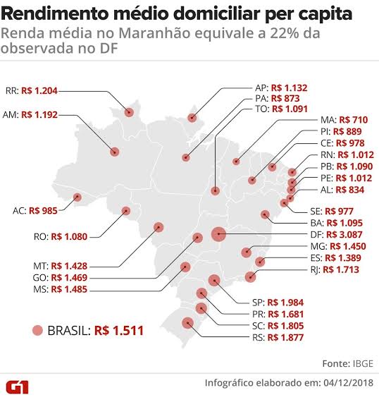 Em 2018, o rendimento médio mensal real do 1% da população com maiores rendimentos era de R$ 17.158, o que corresponde a 22,7 vezes o rendimento dos 50% da população com os menores rendimentos (R$ 757).